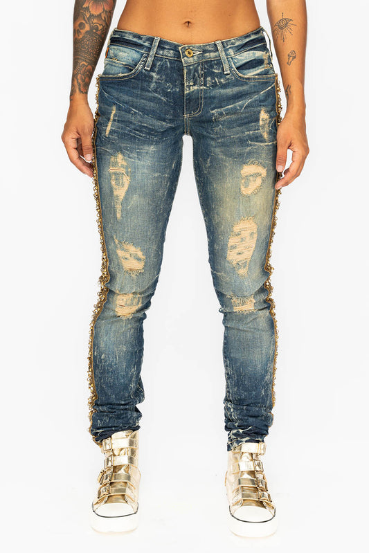 KILLER FLAP SKINNY JEANS IN ASTRO BLUE WITH GOTHIC EMBROIDERY AND CRYSTALS