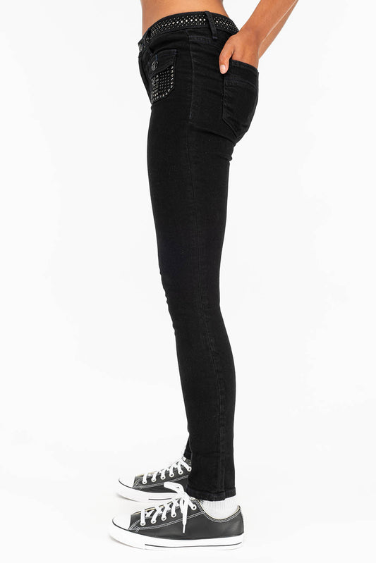 LONG FLAP SKINNY JEANS IN CRYSTAL BLUE WASH WITH STUDS AND CRYSTALS