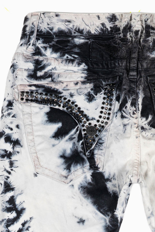 LONG FLAP SLIM FIT MENS JEANS WITH CRYSTALS IN TIE DYE BLK WASH