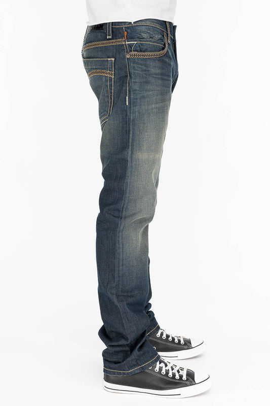 MENS CLASSIC 5 POCKET STRAIGHT LEG JEANS IN BLUE DARK WASH WITH STUDS
