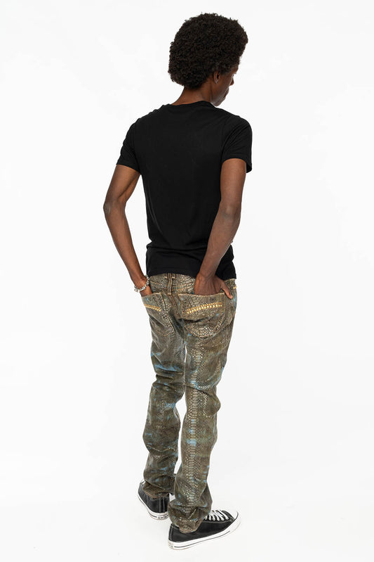 MENS CLASSIC 5 POCKET STRAIGHT LEG JEANS IN REPTILE WASH WITH STUDS AND CRYSTALS