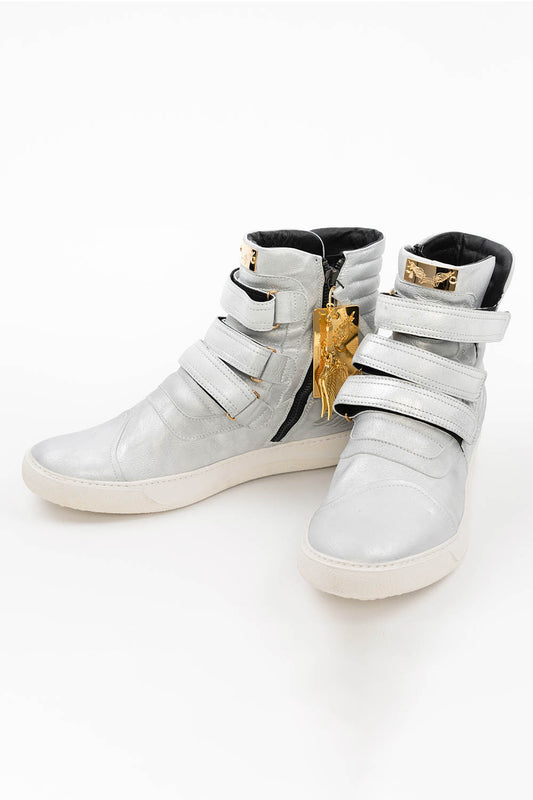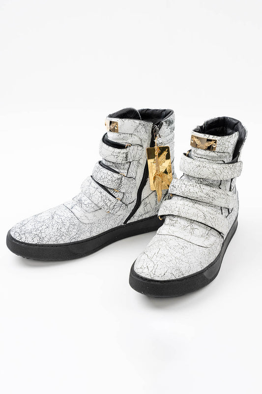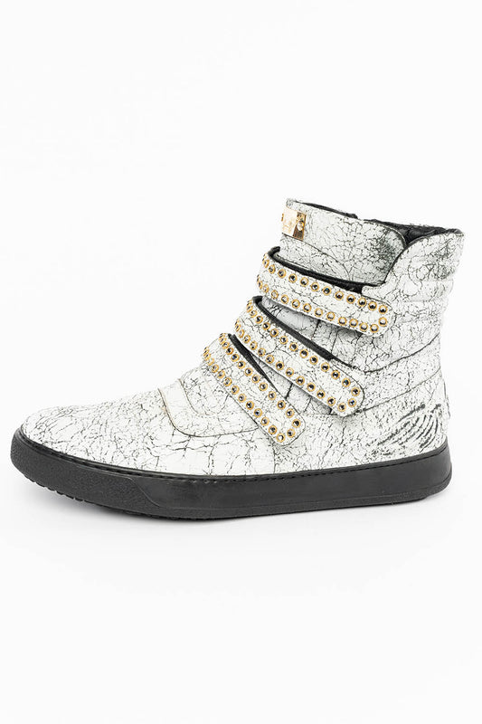MENS HIGH TOP VELCRO SHOES IN CRACKLED WHITE LEATHER WITH CRYSTAL EMBELLISHMENT