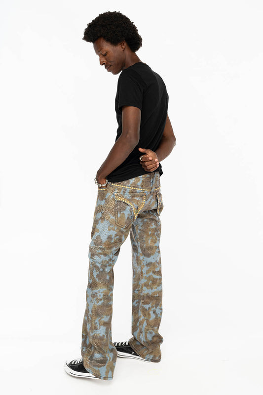 MENS LONG FLAP BOOT CUT JEANS IN SNAKE SKIN WASH WITH CRYSTALS AND STUDS