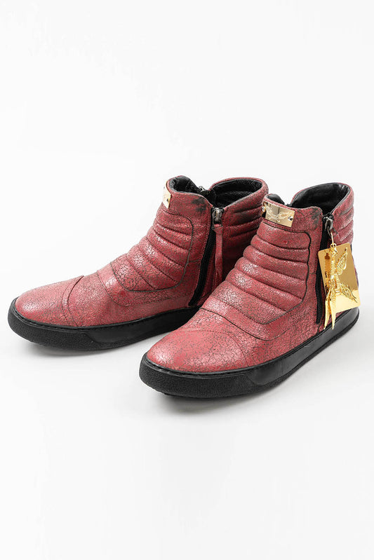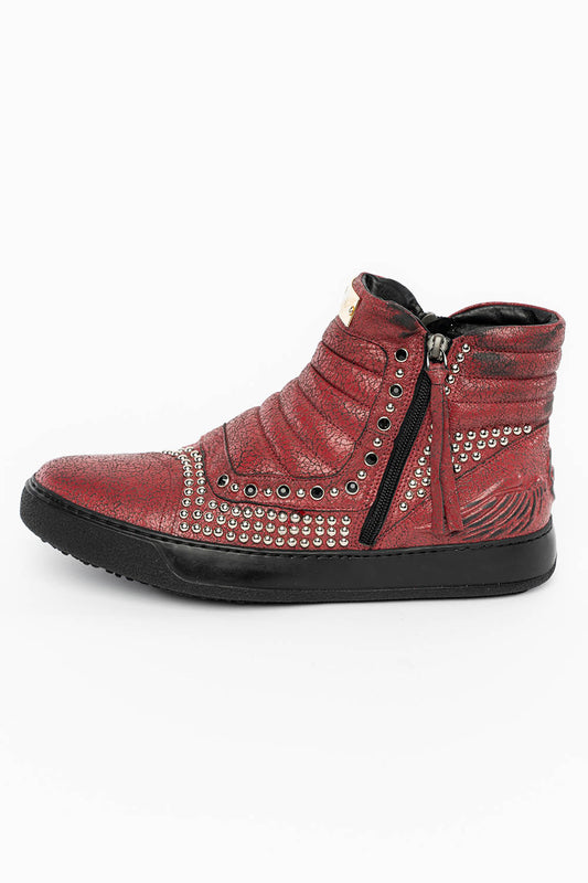 MENS MID TOP BIKER SHOES IN CRACKLED RED LEATHER WITH CRYSTALS AND STUDS EMBELLISHMENT