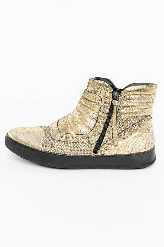 MENS MID TOP BIKER SHOES IN CRACKLED GOLD LEATHER WITH CRYSTALS AND STUDS EMBELLISHMENT