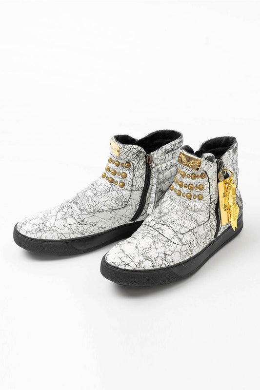 MENS MID TOP BIKER SHOES IN CRACKLED WHITE LEATHER WITH CRYSTALS AND STUDS
