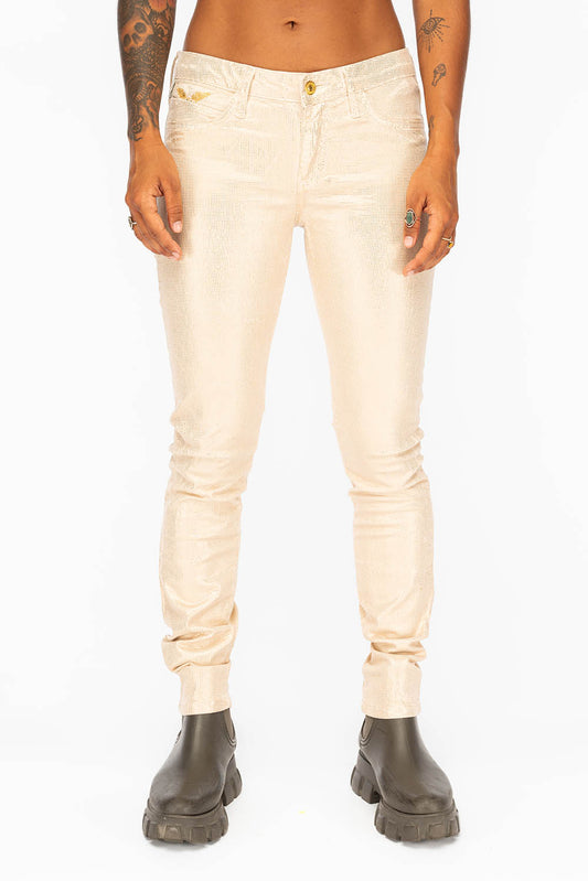 MID RISE WOMENS SKINNY JEANS IN BEIGE DISCO COATING
