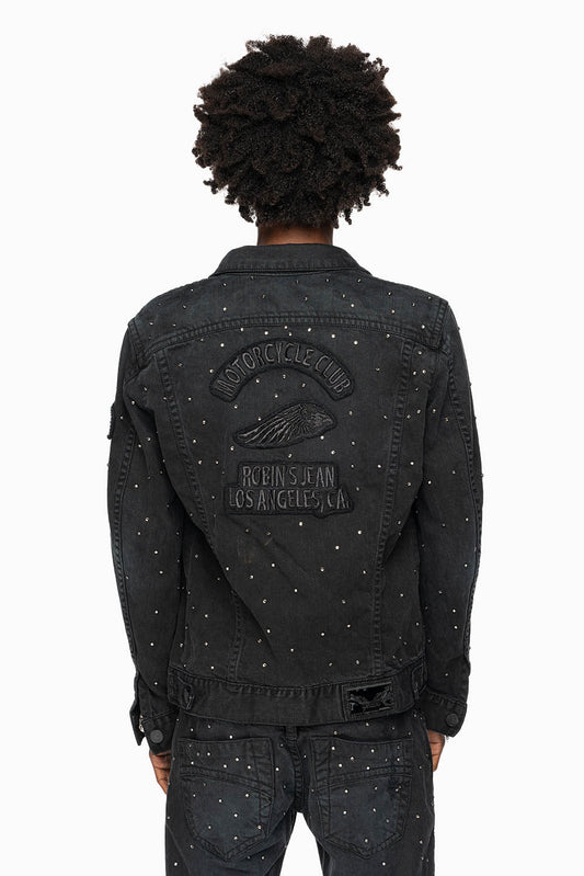 MOTORCYCLE CLUB DENIM JACKET IN VINTAGE BLK WASH WITH PATCHES AND CRYSTALS