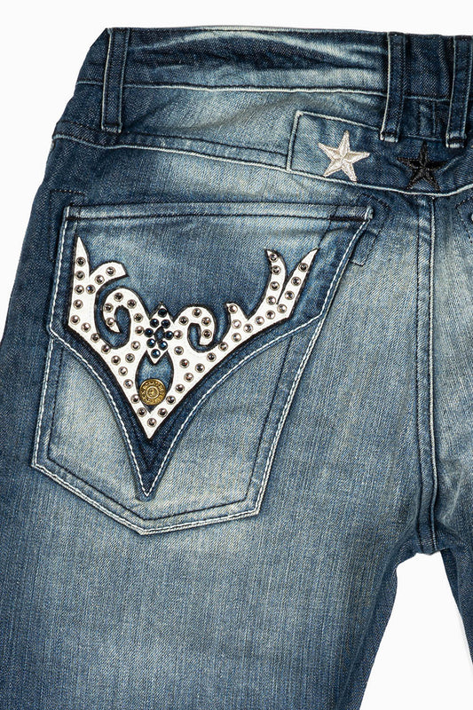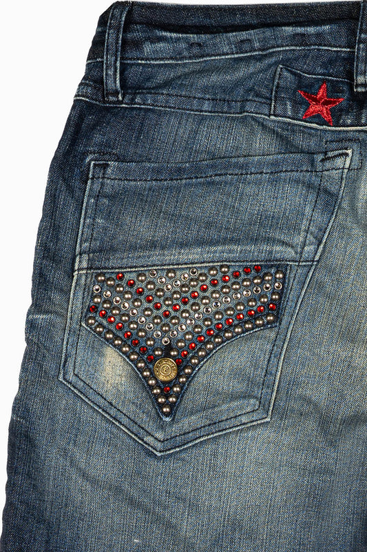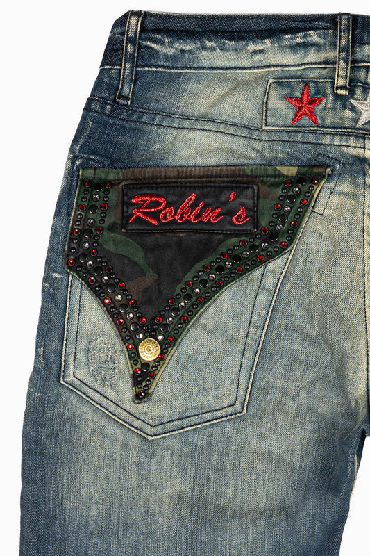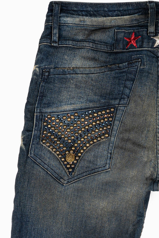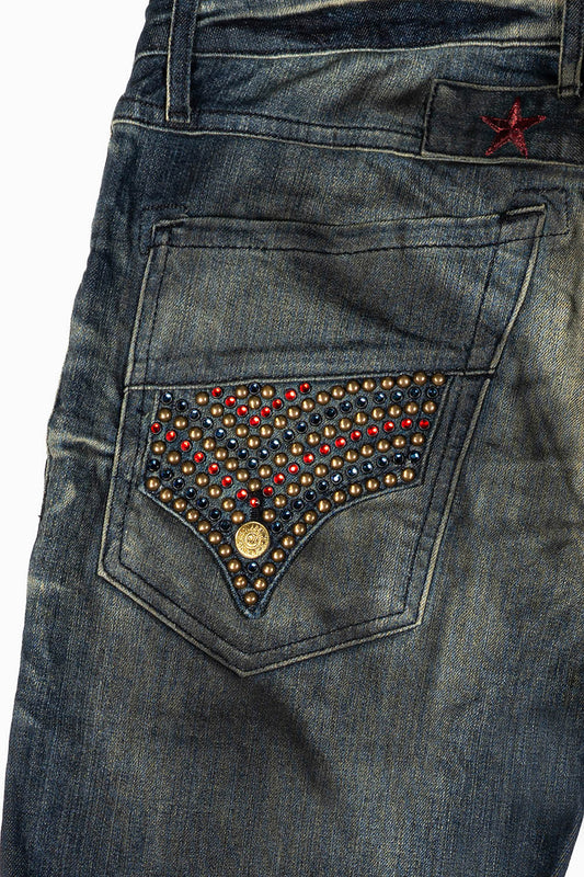 ROBINS RED LABEL LONG FLAP SLIM JEANS IN TAR WASH WASH WITH RED & BLUE CRYSTALS AND NAILHEAD