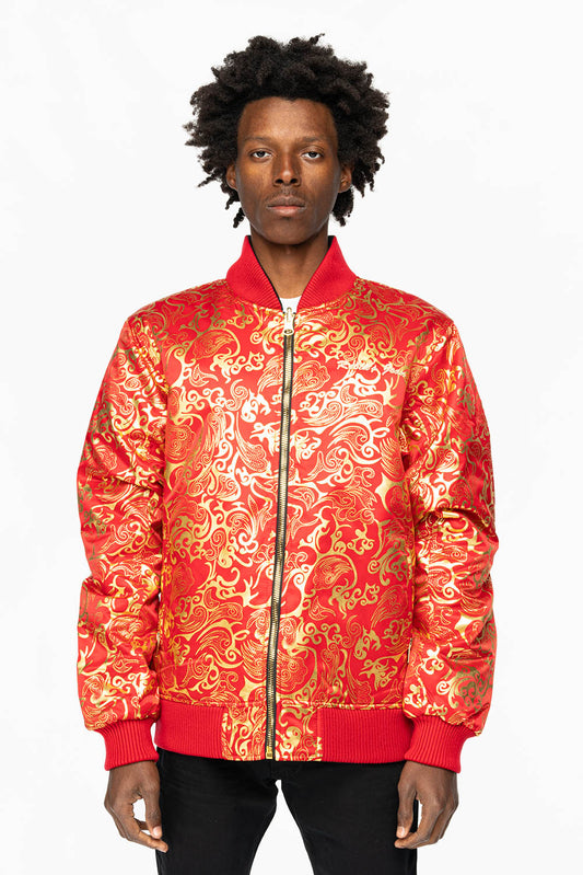 ROBIN’S REVERSIBLE VARSITY BOMBER JACKET IN RED/GOLD