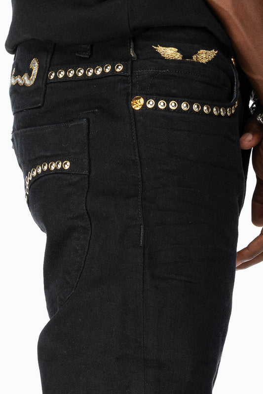SKINNY JEAN IN PURE BLACK WITH GOLD/SILVER ROBIN’S LOGO EMBELLISHED WITH GOLD NAILHEAD STUDS