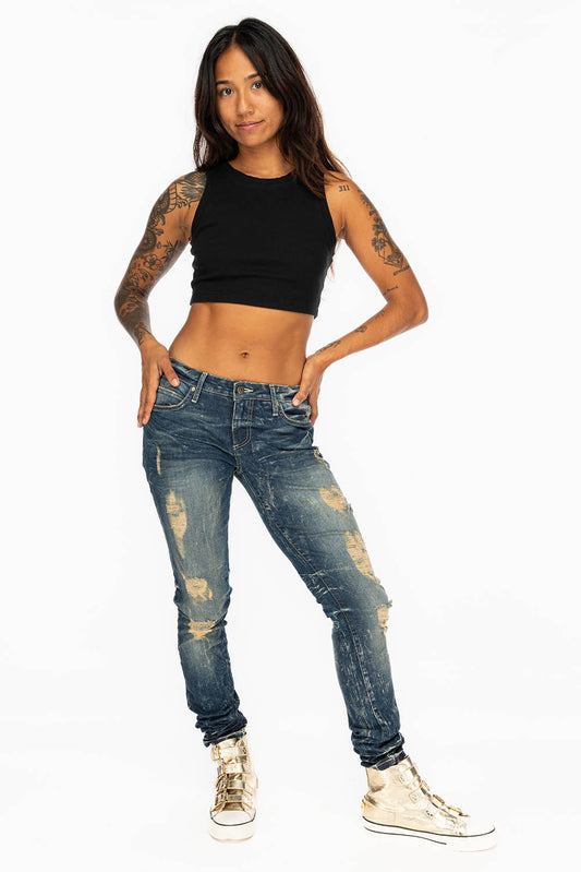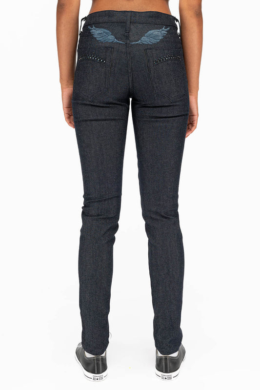 WOMENS CLASSIC 5 POCKET SKINNY JEANS WITH MONTANA BLUE CRYSTALS IN RAW