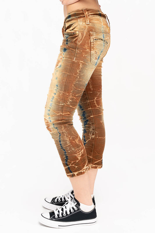 WOMENS RIPPED SKINNY CAPRI PANTS IN 4D LIGHT PERU WITH STUDS AND CRYSTALS