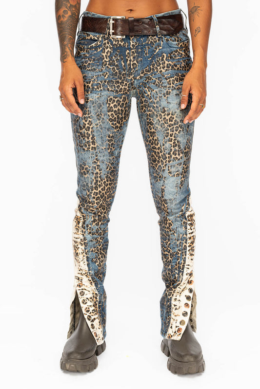 WOMENS BLUE JEANS WITH LEOPARD COATING AND ANKLE SNAP CLOSURE