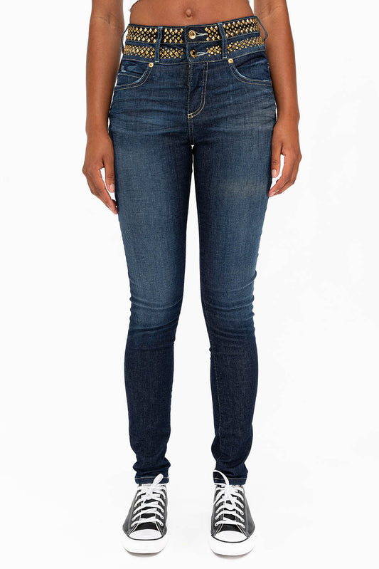 WOMENS KILLER FLAP DOUBLE WAIST HIGH RISE SKINNY JEANS IN LIBERTY DARK WITH STUDS AND CRYSTALS