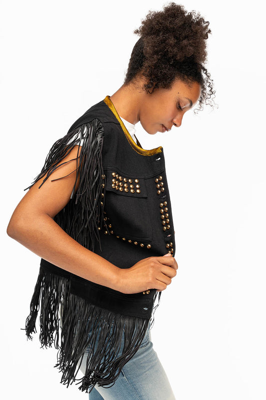 WOMENS STUDDED FRINGE VEST IN BLACK