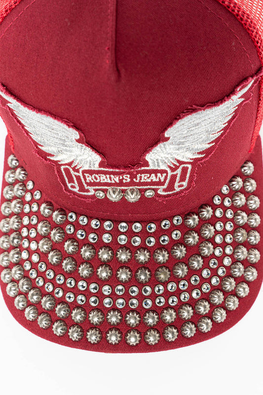 BURGUNDY TRUCKER HAT WITH RED CRYSTAL AND SILVER NAILHEAD EMBELLISHMENT