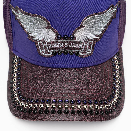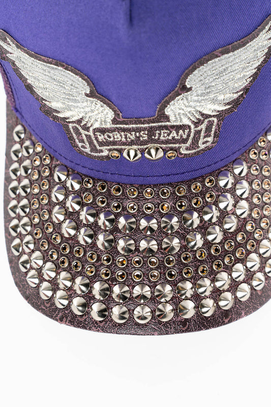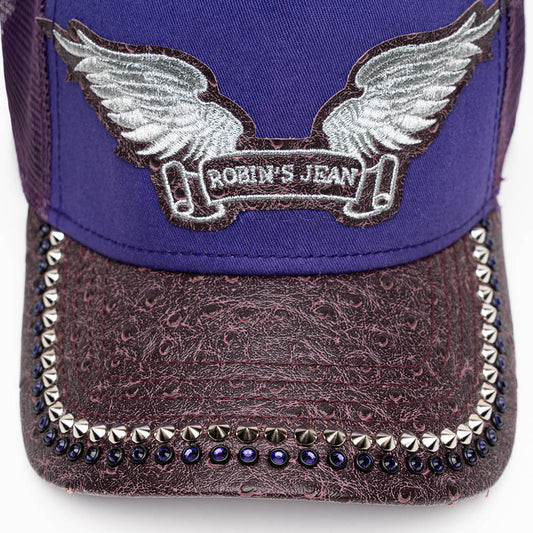 PURPLE/WINE OSTRICH TRUCKER HAT WITH SILVER SPIKE/PURPLE CRYSTAL EMBELLISHMENT