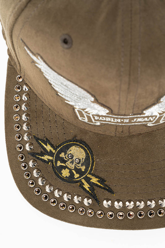 MICRO SUEDE CAP IN OLIVE /CAMEL COLOR IN GOLD WING LOGO EMBROIDERY WITH EMBELLISHMENT