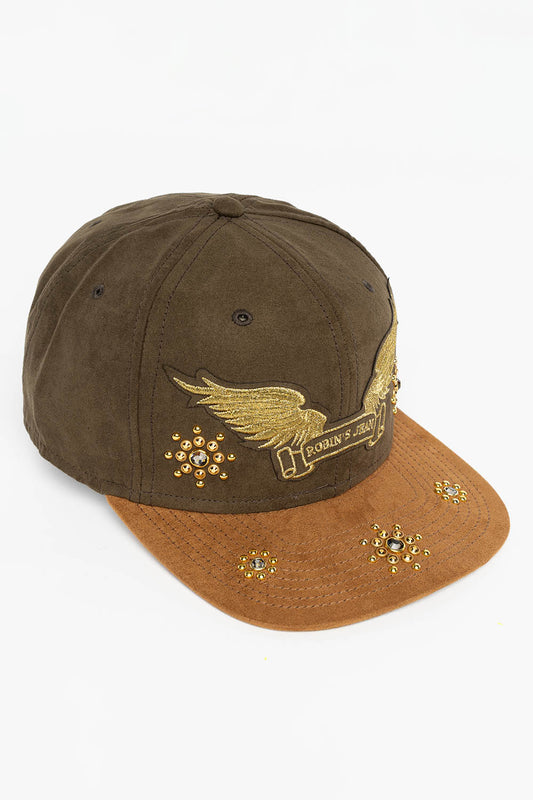 MICRO SUEDE CAP IN BROWN/STONE COLOR IN GOLD WING LOGO EMBROIDERY WITH EMBELLISHMENT