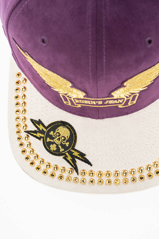 MICRO SUEDE CAP IN GRAPE/STONE COLOR WITH GOLD EMBROIDERY WINGS STUDS AND CRYSTALS