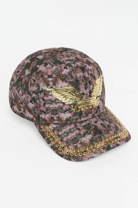 GREEN CAMO SNAPBACK HAT WITH GOLD EMBOSSED WINGS WITH GOLD EMBELLISHMENT