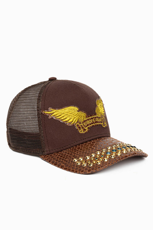 BROWN PYTHON TRUCKER HAT WITH GOLD EMBELLISHMENT