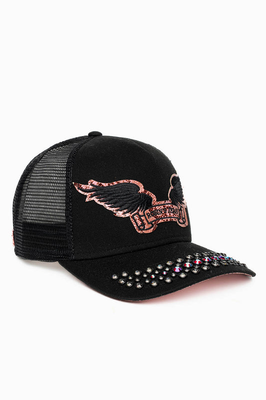 BLACK/SALMOM TRUCKER HAT WITH ROBIN’S SIGNATURE WING LOGO WITH RED AND BLK DIAMOND EMBELLISHMENT