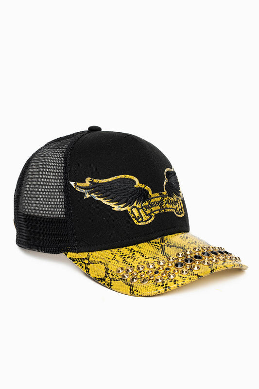 BLK/YELLOW CITRIN PYTHON TRUCKER HAT WITH JET BLK AND AURUM CRYSTAL EMBELLISHMENT