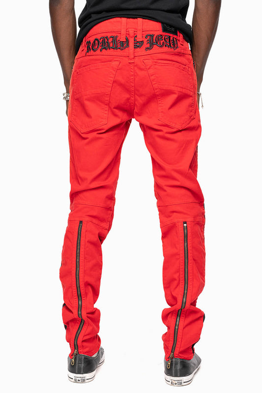 MENS BIKER JEANS IN RED SP FABRIC WITH BLK STRIPES