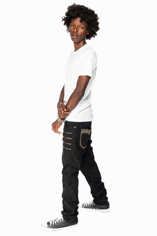 MENS MOTORCYCLE ZIPPER SLIM JEANS IN BLACK WITH STUDS AND CRYSTALS