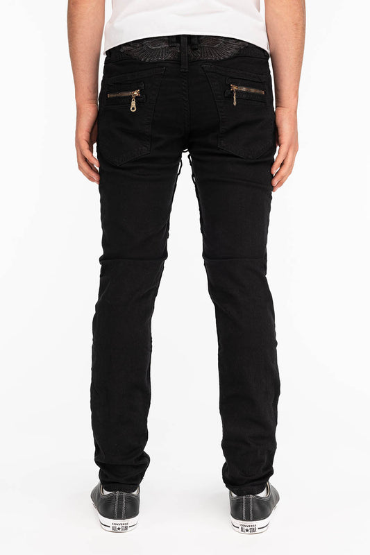 MENS MOTORCYCLE ZIPPERS SLIM JEANS IN OVERDYE BLACK WASH