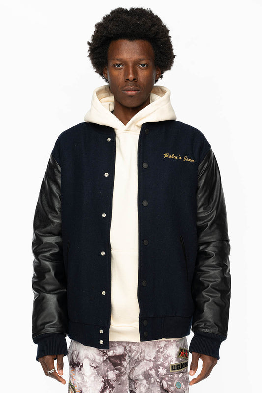 ROBIN’S WOOL & LEATHER VARSITY BOMBER JACKET IN NAVY/BLACK