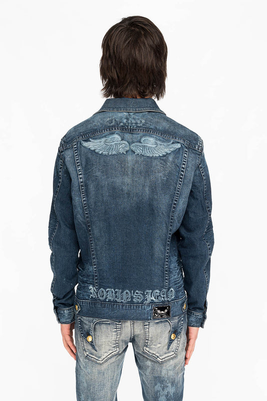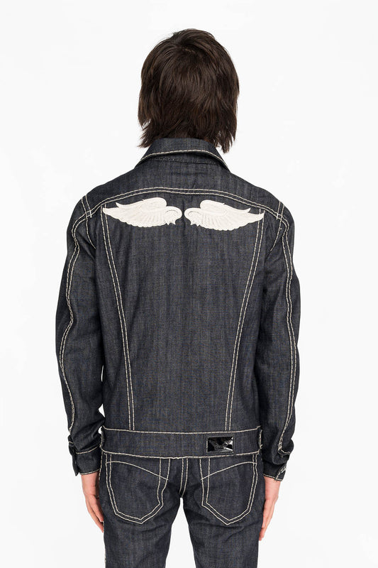 MENS DENIM JACKET IN RAW DENIM WITH HEAVY NATURAL WHITE STITCHING AND EMBROIDERED WINGS