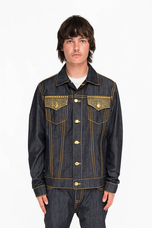 ROBINS RAW DENIM COLLECTION MENS JACKET IN RAW INDIGO DENIM WITH AURUM CRYSTAL AND STUDS