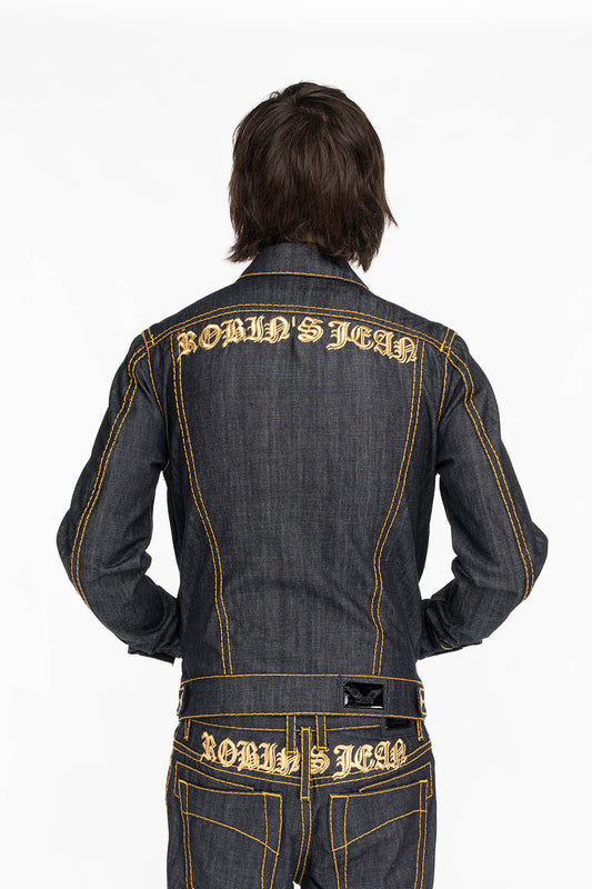 MENS DENIM JACKET IN RAW DENIM WITH HEAVY ORANGE STITCHING EMBROIDERY AND CRYSTALS