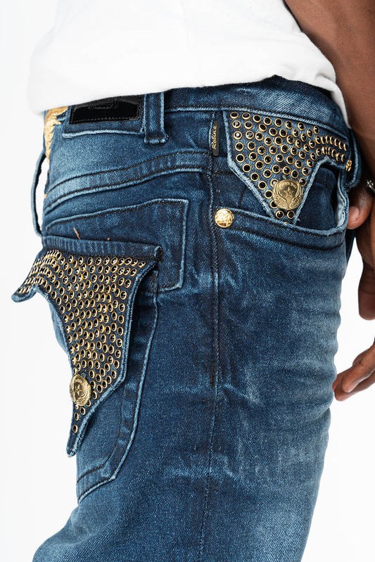 LIMITED EDITION MENS SHORT WITH FLAP POCKETS IN OMAHA MEDIUM WASH WITH CRYSTALS AND STUDS