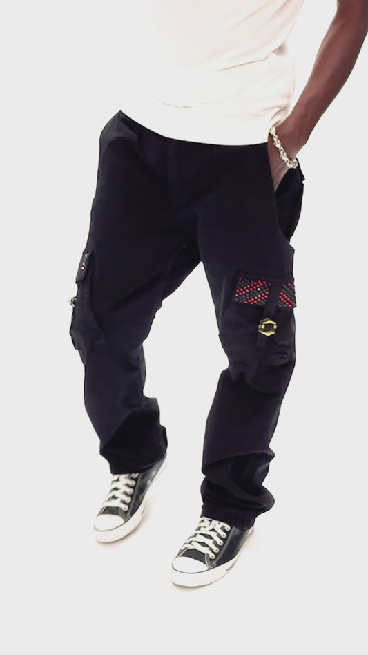 ROBINS NEW MILITARY STYLE CARGO PANTS IN BLACK WITH JET BLACK AND RED CRYSTALS