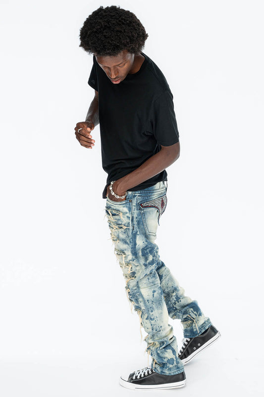 MARLON RIPPED,BROKEN HAND REPAIRED DENIM JEANS IN MANDAN BLUE WITH STUDS AND CRYSTALS