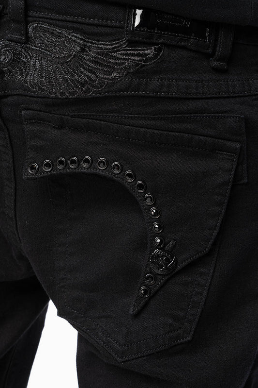 KILLER FLAP SKINNY JEANS FULLY EMBELISHED WITH CRYSTALS IN PURE BLACK WITH GOTHIC EMBROIDERY
