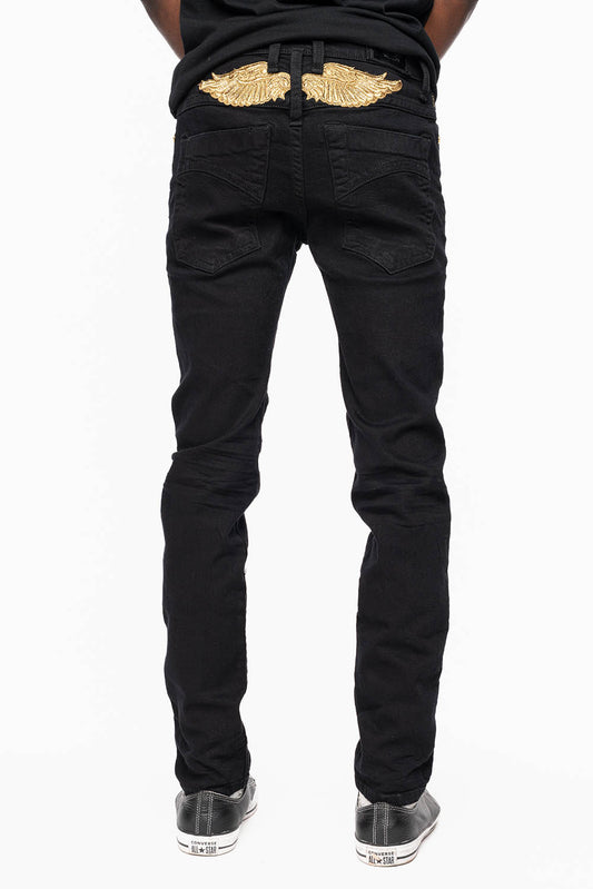 MENS SKINNY JEANS IN PURE BLK WASH WITH GOLD WING EMBROIDERY