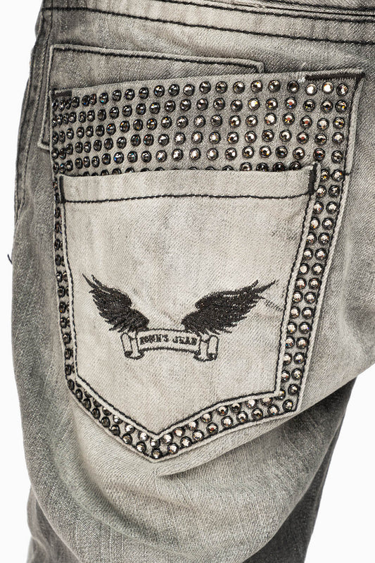 STRAIGHT LEG JEANS IN CHARCOAL MODOC BROKEN WASH EMBELLISHED ALL OVER WITH CRYSTALS