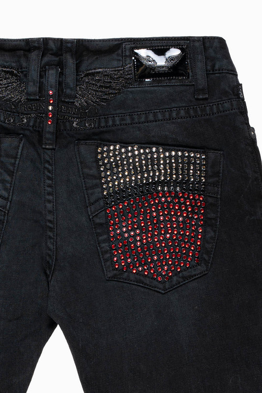 ROBIN'S STRAIGHT LEG JEANS IN VINTAGE BLACK BROKEN WASH WITH FULL EMBELLISHED BACK POCKETS WITH CRYSTALS