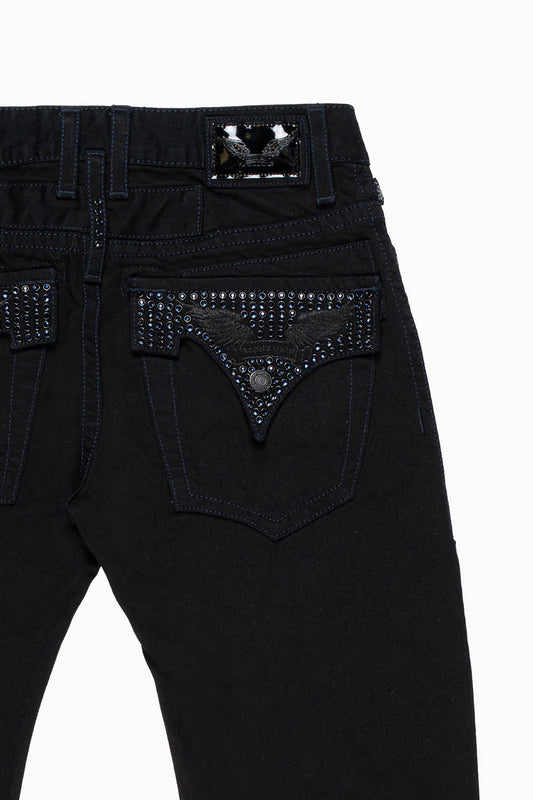 KILLER FLAP MENS STRAIGHT LEG JEAN IN PURE BLACK EMBELLISHED WITH SMOKEY TOPAZ CRYSTALS