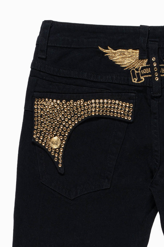 CLASSIC STRAIGHT LEG JEANS IN BLACK WASH EMBELLISHED WITH STUDS & CRYSTALS