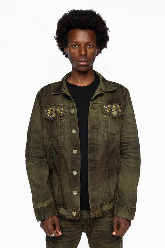 DRK GREEN JEAN JACKET EMBELISHED WITH CLEAR CRYSTALS AND PYRAMID