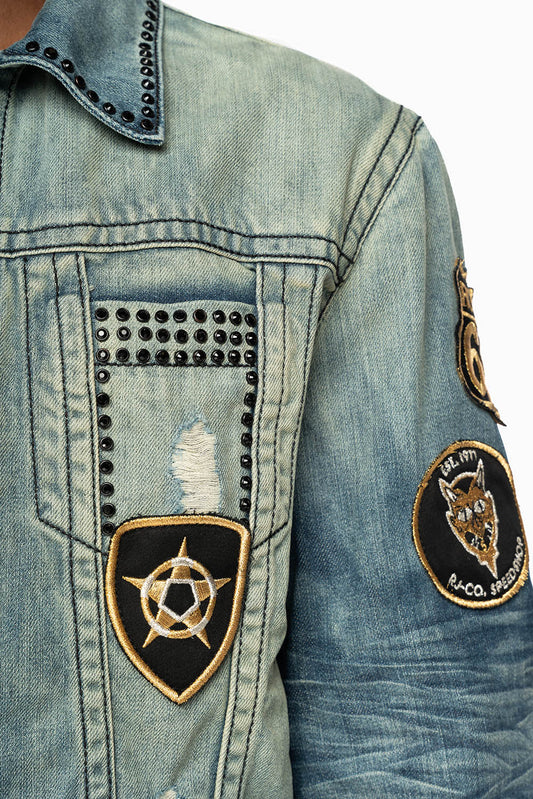 MOTORCYCLE CLUB DENIM JACKET IN MODOC WASH WITH PATCHES STUDS AND CRYSTALS