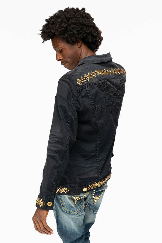 MENS DENIM JACKET IN PURE BLACK EMBELLISHED WITH RED CRYSTALS