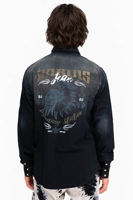 WESTERN NATIVE AMERICAN STYLE MENS DESTROY DENIM SHIRT IN F_ED UP BLACK