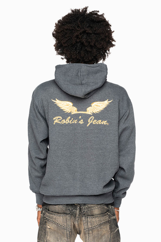 PULLOVER HOODIE IN DARK HEATHER WITH GOLD WINGS EMBROIDERY
